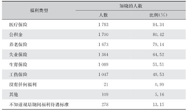 住院医师对规培期间福利待遇知晓率较高,均在50%及以上(表81)。13%的被调查者不知道规培期间福利待遇标准。住院医师对规培福利待遇等细则方面的了解不够细致可能是他们产生待遇较预期低这样的心理落差的原因之一。