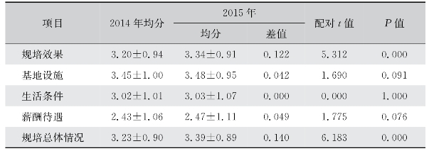 在政策认知方面,2013级住院医师在经过2年规培后,对于规培政策和规培要求的了解程度都有明显提升(表84)。统计检验结果显示,差异有统计学意义。但是,在对规培政策的支持方面评分有下降(表84)。这或许和当前医疗环境和政策大环境有关,表明在政策解读、改善规培策略等方面的工作需进一步加强。