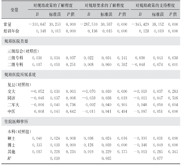 不同学历住院医师之间的比较,以本科学历住院医师为对照,随着学历的提高,住院医师对政策的认知程度在提高,但是对于政策的支持程度在下降(见表87)。尤其是硕士学历的住院医师对于政策的支持程度是最低的,B值为-0.191(P=0.000)。