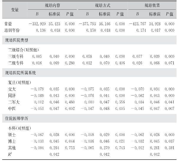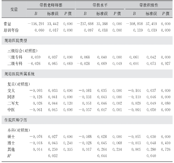 对带教老师的满意度方面,随机效应模型结果显示,随着规培年份的增加,住院医师对于带教老师师德、带教水平、积极性的满意度都呈现增加(B值分别为0.06,0.97,和0.119,且P=0.000)(表89)。