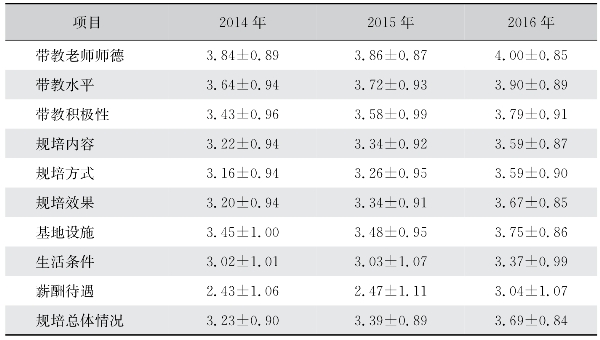 住院医师对规培政策的满意度方面,2016年度为3.69分(相当于100分值的74分)。其中,无论是对带教老师的评价、对规培内容和方式的满意度、对基础设施及薪酬待遇的满意度,都呈现随年份增加的趋势,而且2016年的满意度增加程度明显优于2015年度的满意度增加程度(表88)。