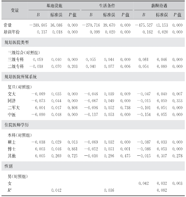 对规培后勤保障的满意度方面,随机效应模型结果显示,随着规培年份的增加,住院医师的满意度都呈现较明显增加(B值分别为0.117,0.099,和0.162,且P=0.000)(表91)。