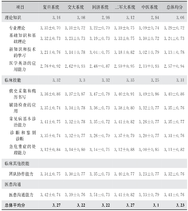不同系统之间比较,复旦系统和二军大系统被调查者的自我评分高于其他系统。交大系统在各方面的评分与总体水平相当;同济系统在“医患沟通能力”方面的评分较高,但是在“理论知识”方面评分偏低;中医系统的各方面评分都略低于总体水平,尤其是在“理论知识”方面(表95)。