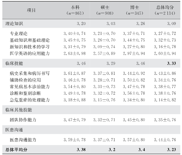 在培医师的自评总体平均分为3.23分(相当于65分)。其中,对医患沟通能力和临床技能方面的评分较高,分别为3.44分(相当于100分的69分)和3.33分(相当于100分的67分)。不同学历在培医师之间比较,博士与本科的自评分相当,为3.4分左右(相当于68分),略高于硕士的3.20分(表94)。