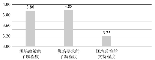 对政策认知程度方面,规培毕业生对规培要求的了解程度最高,评价得分为3.88分;对规培政策的了解程度也较好,得分为3.86分;对规培政策的支持程度相对较差,得分为3.25分(图7)。