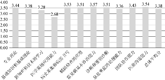 在能力提升方面,毕业生认为自己在常见病基本诊治能力、病史采集和病历书写、辅助检查的应用、诊断和鉴别诊断等临床技能方面的能力以及医患沟通能力的提升程度较高,分值都在3.5分以上;认为自己在理论知识和团队协作能力方面的提升程度较低,尤其是在新知识和技术的学习以及医学英语应用能力方面,分数都在3.3分以下(图8)。