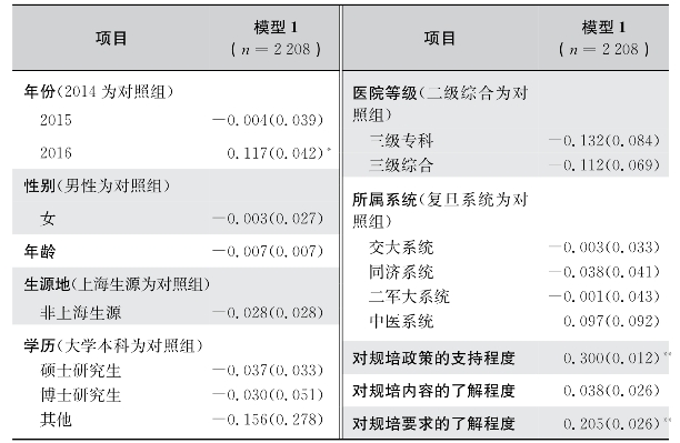注:①*P<0.05;**P<0.01;②21个专科也作为控制变量放入各模型中,基本没有统计学意义,故不呈现具体结果;③括号中为标准误差