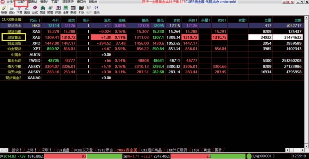 图13 选择CURR贵金属后的国际黄金行情窗口