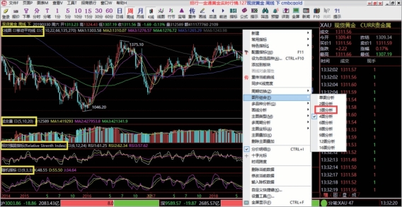 初始下载行情软件后,从月线图到1分钟图所有的周期图,默认为4图分析组合,包含K线、成交量、相对强弱指标、随机指标。笔者认为这些指标在实盘中所起到的作用是不太大的,尤其是成交量指标,因为国际黄金行情的成交量是十分巨大的,但同时又是十分分散的,国际黄金行情的成交量指标不会像国内的股票那样能较精确地反映出此时的成交结果。所以可以如图15所示,点击鼠标右键,设置为“3图分析”,这样也不会显得界面太杂乱。