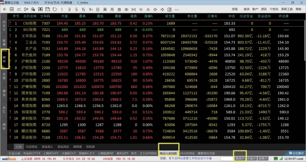 如图30所示,左边的选项包含了股票、期货、外盘、黄金、外汇、期权等交易品种。点击“期货”,选择“商品分类”,可以看到国内商品期货的各个品种走势。右下方为实盘账户登录图标。