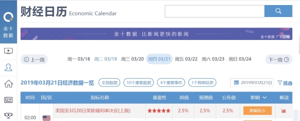 例如北京时间2019年3月21日凌晨2:00,美联储宣布至2019年3月20日维持美国利率上限为2.5%,下限为2.25%。这一决定完全符合外界预期,但决议声明中释放了强烈的“鸽派”信号:美联储将今年加息次数预期从2次调降为0次,维持2020年加息1次的预测。虽美联储宣布利率维持不变符合预期,但决议“鸽派”(不加息,不看好美国经济)程度大超预期,预计今年内不加息,并明确计划2019年9月末停止缩表[1]。决议出炉后,国际黄金一度暴涨12美元至1313.46美元/盎司,美指急挫。2019年3月20日美联储利率决定报告如图45所示。