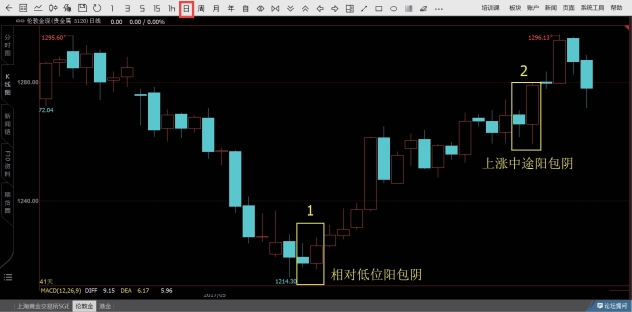 阳包阴组合一般是在下跌后到达大形态的相对支撑位或在低位起涨时出现意义较大一些,并且上涨空间会很大,如图82位置1处。如果出现在横盘中或者一轮单边上涨过程中,那么后期涨幅空间可能有限,如图82位置2处。如果出现在上涨后的顶部其意义不大,因为所处相对高处的阻力位极有可能接下来的行情趋势是下跌,所以很有可能阳线会被大阴线吞没。