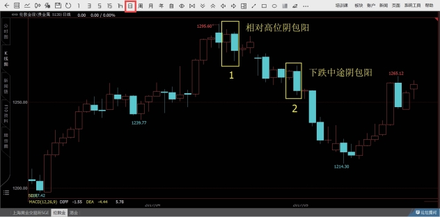 阴线吞没阳线即“阴包阳”是最常见的K线组合,通常运用在60分钟以上的周期图形中,周期太短的话其交易空间不大。
