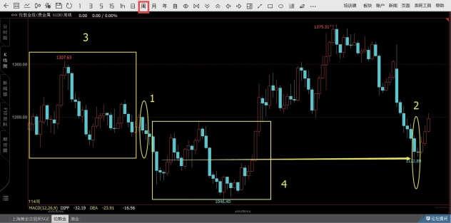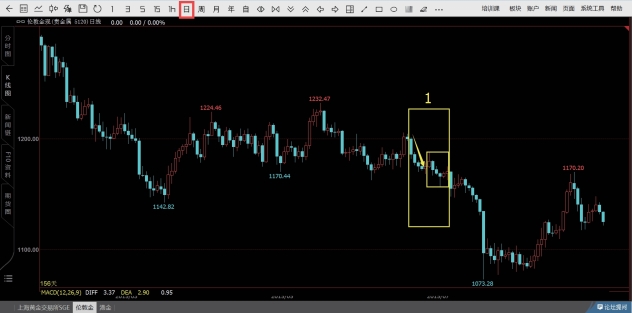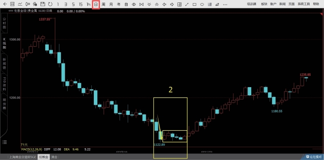 孕空线组合一般被运用在60分钟以上的周期图中,如果此K线组合出现在大形态的相对高位或者一轮单边下跌行情的中途,前一根阴线越长,那么在前大阴后无论是十字星线还是小K线,也无论是阴线还是阳线,在孕空线后继续下跌的可能性就越大,跌幅也就越深,如图90位置1处。如果此K线组合出现在大形态的相对低位,那么继续下跌的可能性就很低,因为行情可能到达了大形态的相对支撑位,接下来上涨的可能性较大,如图91位置2处(到达了前方密集区中轴支撑位)。