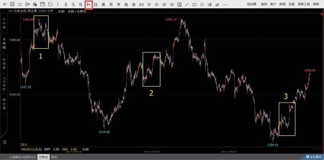 两阳夹阴组合通常被运用在中大周期图中,例如60分钟以上的周期图,周期越大、阳线实体越长、中间夹的阴线越短,图形就越明显,其后就越有可能上涨。如果此形态出现在大形态的相对低位或者一轮单边上涨行情的中途,那么接下来延续上涨行情的可能性很大,例如图93位置2处和3处。但如果处于大形态的相对高位,那么延续上涨行情的可能性就很小,因为行情到达了相对高处的阻力位,很可能由涨转跌,例如图93位置1处。