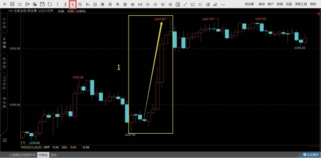 绝地反攻现象通常被运用在60分钟图形中作为参考依据,之所以会出现绝地反攻现象有可能是因为出现一轮60分钟图级别急跌后行情立刻V字反转,也有可能是低位构筑震荡修整形态,待蓄势构底成熟后向上变盘大阳突破。需要注意的是,这种大阳拉升现象也可能出现在消息窗口或欧美开盘时间窗口,在这两个窗口之前就应做好充分的准备。如果消息面预期利多同时行情又处于相对低位,那么当消息公布时,更容易出现大阳线。特别是前面蓄势越久,一旦出现爆发式突破,其后上涨会延续一定的时间。当出现这种情况时,也可以切换至更小的1分钟周期图去寻找中继平台多单进场。