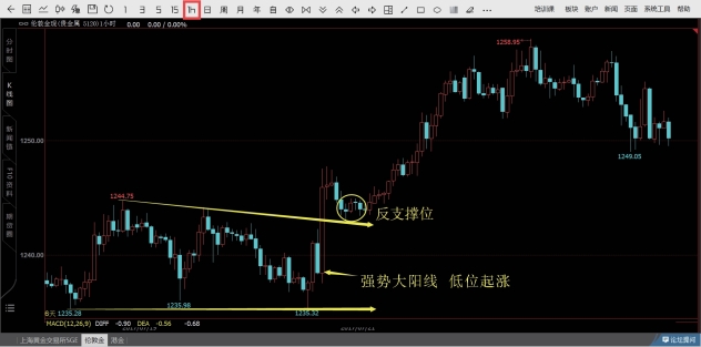 由图104和图105可以观察出,出现在相对大周期中的绝地反攻现象,在相对小周期中其实就是几根阳线持续上涨的状态,上涨的阳线越急越强,反映在相对大周期的阳线就越大。