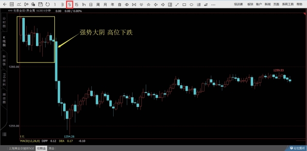 由图106和图107可以观察出,出现在相对大周期中的一叶知秋现象,在相对小周期中其实就是几根阴线持续下跌的状态,下跌的阴线越急越强,反映在相对大周期的阴线就越大。