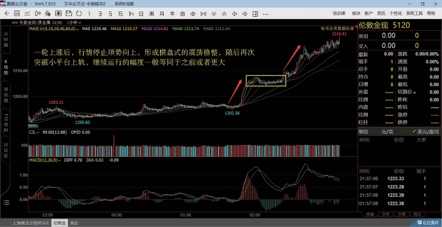 无论是到达多单买点位置还是止盈位置或是止损位置时,都可以通过切换至5分钟图或1分钟图中去观察,以达到更加精准的介入。