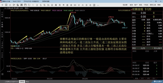 这种多头行情的释放,是只出现两浪还是三浪,是否还会出现主升浪,这些都是难以确定的,只能边走边看,所以最好设好保本损位和移动损位后就一直持有。当然,前期要看好大形态上方的阻力位位置,作为一个止盈位的极限。