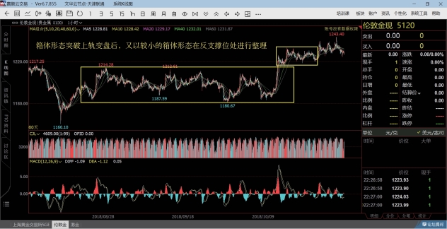 (3)在箱体末端区域重心上移,突破上轨时可立即追进多单或增仓多单。