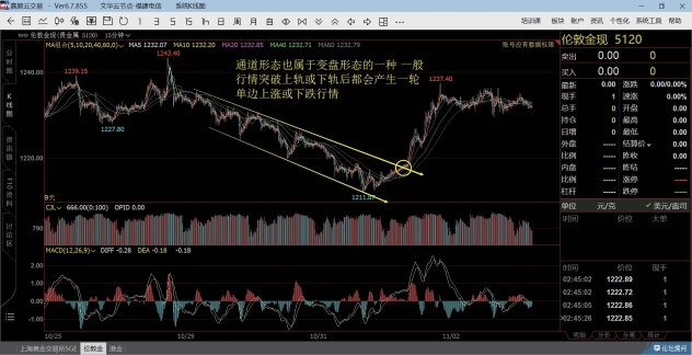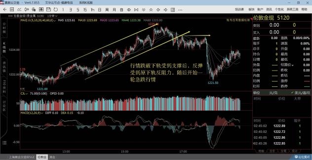 形态中的上轨为阻力位,下轨为支撑位。当价格跌破上行通道下轨后行情看空,在接下来反弹时以原下轨为反阻力位。