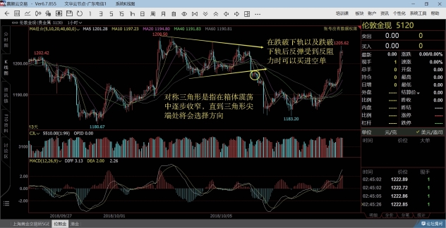 一是在上轨处二次探顶或三次探顶时;二是跌破下轨时和反弹获反阻力时;三是可在三角形的末端重心下移时做好买空单的准备。