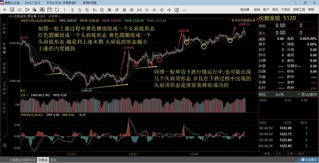 如图146所示,在上升通道中,每一次回踩下轨处都会不断构成头肩底形态。