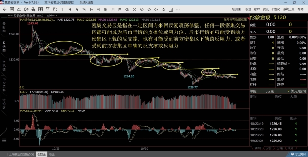 在密集交易区中的波幅的大小根据周期而定,通常产生在急涨急跌之后,行情需要产生修整时。