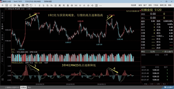 在一轮上涨的末期,在到达阻力位或者区间上轨时,多头行情释放完全,MACD就会走出顶背离的现象。