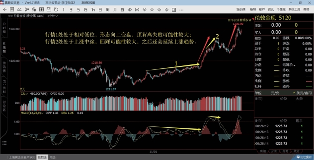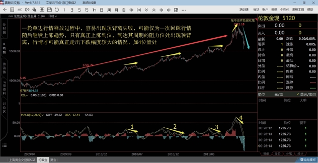 但是所处相对低位的形态向上变盘后的释放初期,或者单边释放过程中途,出现顶背离是很容易失败的,因为行情的趋势为涨,而逆趋势而为的行情一般都会被层层突破。