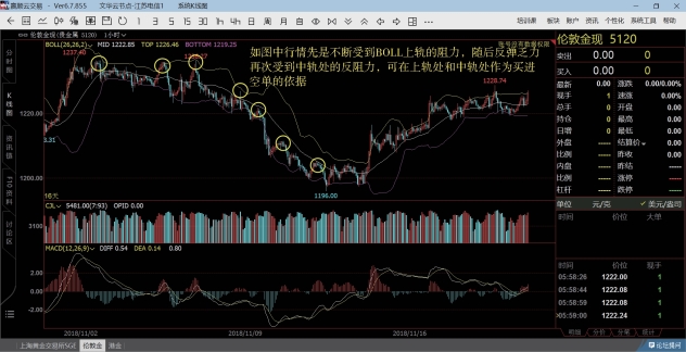 (1)在价格处在横盘或震荡中时,BOLL的上轨线将是价格的阻力区域,受阻力度和随后的回落力度要根据实盘而定。