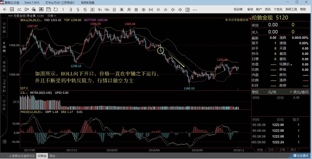 在扭转趋势向下运行时,K线会紧贴着下轨线盘跌,并以中轨为第一阻力位,同时3根均线在向下开口后逐步下移。