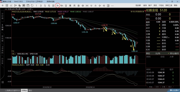 切换至60分钟图(图166)后,行情变得更加明朗,日线图形态中的最后一小浪,在60分钟图中是由三浪加主跌浪进行展开的。接下来进单就分为两种了:第一种,如果比较激进,那么在60分钟图拉完主跌浪的大阴线后,就立刻轻仓买进多单(轻仓的原因是防止还有低点),随后设止损位为日线图前低点;第二种,等待60分钟图收第一根阳线后,较稳妥时再买入。但无论通过以上哪种方式买进时,都可以切换至更小的周期图,例如到5分钟图中去观察。例如第一种买入方式,在大阴线出现的瞬间,立刻切换至5分钟图甚至1分钟图,去观察60分钟图中的第4小浪在5分钟图或者1分钟图中是否也是由三浪或者三加一浪构成,如果是的话,那么就可以在小周期中收复其最后一小浪时大胆买进。