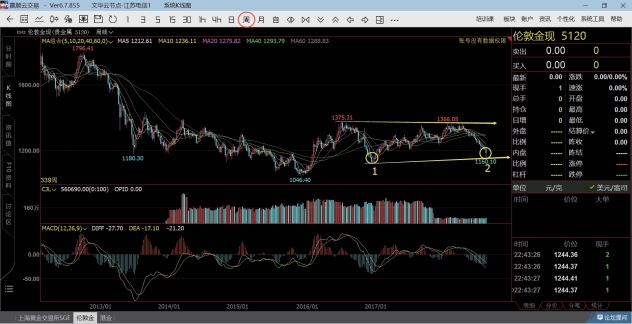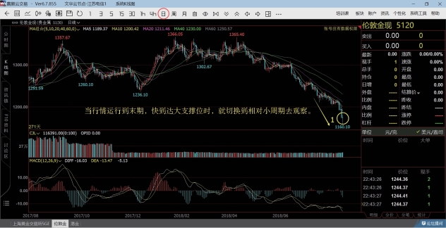图164为国际黄金周线图行情。首先,我们在分析行情的时候要明白一点,不管是做周线图的行情,还是做60分钟图的行情,看周期图要由大到小去看,这是有益无害的。由图164可得知,2处将要到达前方1处的低点位置,为二次探底形态,这说明周线图的大操作机会就要来了。遇到这种机会要尽量去把握,一是因为一轮周线图的下跌到达了支撑位,显示在日线图或者60分钟图中就是跌了很久的单边行情,那么接下来上涨的可能性很大;二是因为在这种大周期图形态的支撑位处,就算不回调也会有个小反弹,但就算是较小的反弹,在60分钟图中也能构成一个小波段行情,可以说大概率一买即赚。有了这样的预期后,就要时刻观察它接下来的运行走势,但看周线图是不行的,因为它不能实时反映出行情到底是怎么运行的,这就要经常切换至日线图甚至60分钟图中去仔细观察了。