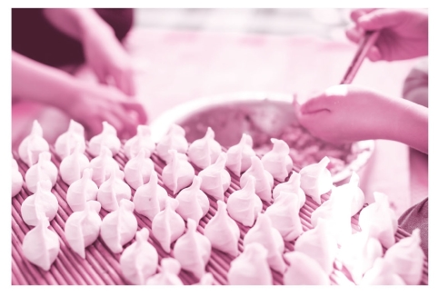 每年的大年三十,我们都会回到家乡和姥姥一起包饺子。每一次我都下定决心,一定要学会姥姥那精湛的手艺,可是刚做了两个,就开始用面团和饺子馅儿建造起神奇的动物王国:小狗、小鸟、小鸡、小鸭……