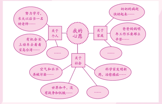 一百年来,无数优秀的中华儿女为了中华民族的伟大复兴,进行了艰苦卓绝、可歌可泣的斗争,他们共同的心愿就是实现人民对美好生活的向往。你的心愿是什么?仔细想一想,选择你最想和别人交流的心愿写下来。下面的角度供参考。