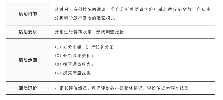 学生分组收集资料,选择上海科技馆研学旅行基地进行资料查找,通过对环境、选址、运营模式、研学旅行课程等相关资料的收集,生成调研报告,总结上海科技馆在研学旅行过程中是如何体现优势与规避不足的。表1-4所示为任务实施方案表。