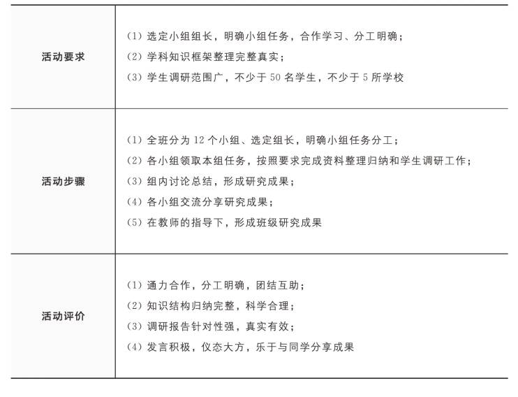 全班分为12个小组,从小学一年级到高中三年级分12个任务,每小组领一个任务。任务内容:通过收集归纳,整理出本年级涉及的语文、地理(科学)、物理、化学、生物五门学科的知识框架图;并通过访谈,调研该学段学生感兴趣的研学主题,形成调研报告。各小组完成任务后,在班级中进行展示分享,最终形成班级调研成果。表3-2所示为任务实施方案表。