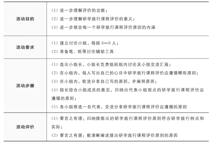 开展一场“研学旅行课程评价原则”交流研讨会。通过研讨会,进一步讨论研学旅行课程评价必须遵循哪些原则,该如何理解每一个原则?表5-1所示为任务实施方案表。