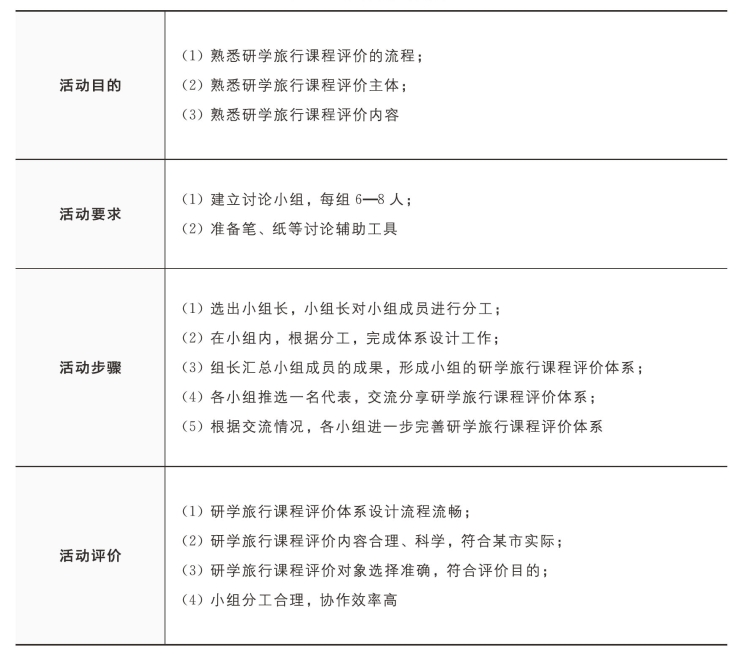 从任务导入中我们了解到,某市急需探索建立市级研学旅行课程评价体系,对研学旅行活动中参与的主体进行评价。请以小组为单位,站在某市教育行政主管部门的角度,为其设计研学旅行课程评价体系。表5-2所示为任务实施方案表。