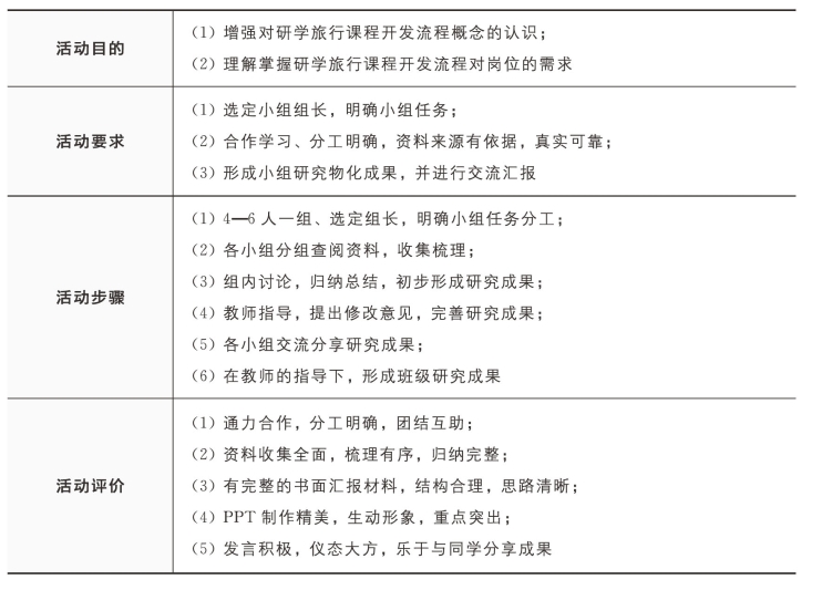 资源为主,根据实地调研,写出你的研学旅行课程开发流程。表6-2所示为任务实施方案表。