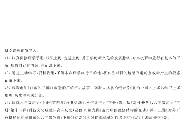 (2)通过了解上海的主要城区地理位置以及所处城市群的人文地貌情况,使用研学手册并结合课本知识,开启海派文化研学之旅,提升文化素养。