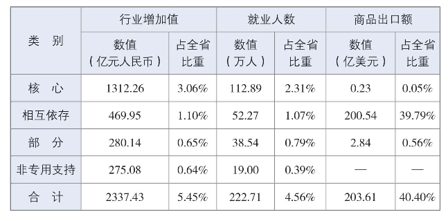 2018年四川省版权产业的行业增加值为2337.43亿元人民币,占全省GDP的5.45%;就业人数为222.71万人,占全省就业人数的4.56%;商品出口额为203.61亿美元,占全省商品出口额的40.40%[1](详见表2-1)。四川省版权产业的经济贡献在我国西部地区居领先水平,同东部沿海地区相比仍有差距。