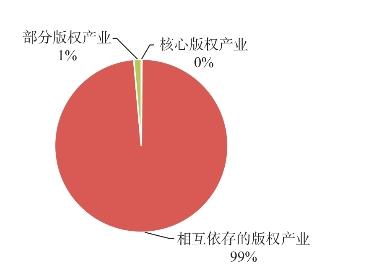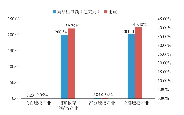 2018年四川省版权产业的商品出口额为203.61亿美元,占全省商品出口额的40.40%。核心版权产业的商品出口额为0.23亿美元,占全省商品出口额的0.05%,占全部版权产业出口额的比重微乎其微;相互依存的版权产业的商品出口额为200.54亿美元,占全省商品出口额的39.79%,占全部版权产业出口额的99%,是版权产业最主要的出口类别;部分版权产业的商品出口额为2.84亿美元,占全省商品出口额的0.56%,占全部版权产业出口额的1%(详见图2-6、图2-7)。