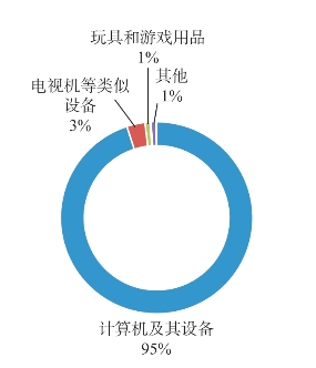 四川省版权产业的商品出口额几乎全部由非核心版权产业贡献,特别是相互依存的版权产业中的计算机及其设备产业组出口额占全部版权产业的95%,出口额较高的其他产业组还有电视机等类似设备、玩具和游戏用品,分别占全部版权产业出口额的3%和1%(详见图2-8)。