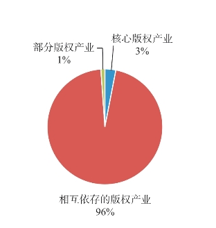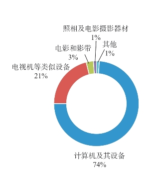 可以看出,相互依存的版权产业也是四川省版权产业中商品进口额最多的类别,特别是计算机及其设备、电视机等类似设备是进口最多的两个产业组,两者分别占全部版权产业进口额的74%和21%(详见图2-11)。