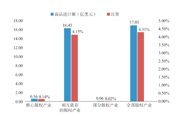 2018年四川省版权产业的商品进口额为17.05亿美元,占全省商品进口额的4.31%。核心版权产业的商品进口额为0.56亿美元,占全省商品进口额的0.14%,占全部版权产业进口额的3%;相互依存的版权产业的商品进口额为16.43亿美元,占全省商品进口额的4.15%,占全部版权产业进口额的96%,是版权产业最主要的进口类别;部分版权产业的商品进口额为0.06亿美元,占全省商品进口额的0.02%,占全部版权产业进口额的1%(详见图2-9、图2-10)。