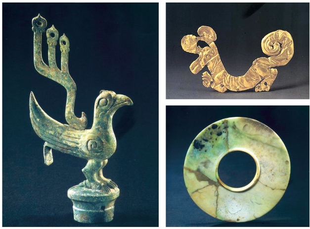图为三星堆博物馆的藏品铜鸟、金箔虎形饰和玉璧。