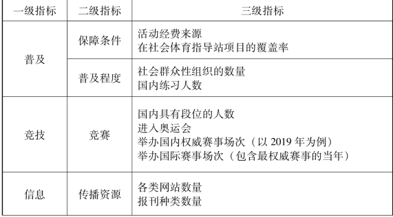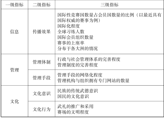 日本武道与中国武术在文化上同宗同源,作为展现两国各自文化底蕴的民族传统体育项目,其现代化发展具有重要意义。本研究通过文献法,梳理出影响中国武术与日本武道现代化发展的系列指标(附录一),并在咨询相关专家意见的基础上(附录二和附录三),最终构建出了由5个一级指标、9个二级指标和24个三级指标构成的中国武术与日本武道现代化发展评价指标体系(表4-1)。